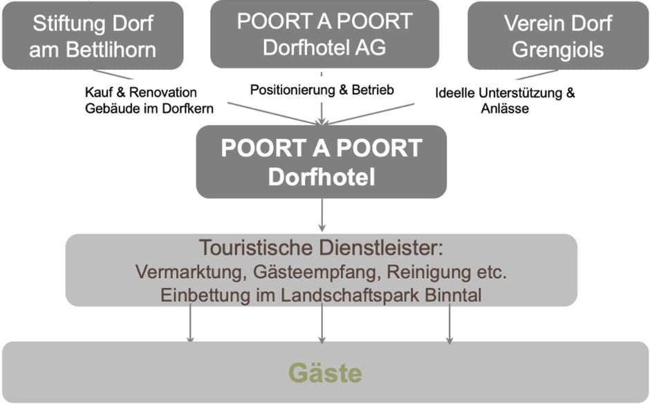 Bei der Führung des neuen Dorfhotels POORT A POORT können Sie auf die Unterstützung der Stiftung Dorf am Bettlihorn, des Vereins Dorf Grengiols sowie der POORT A POORT Dorfhotel AG zählen. Diese Organisationen werden mithelfen, dass die Gäste des Dorfhotels nicht nur «POORT A POORT» mit den Einheimischen wohnen, sondern auch gemeinsame Erlebnisse teilen können.